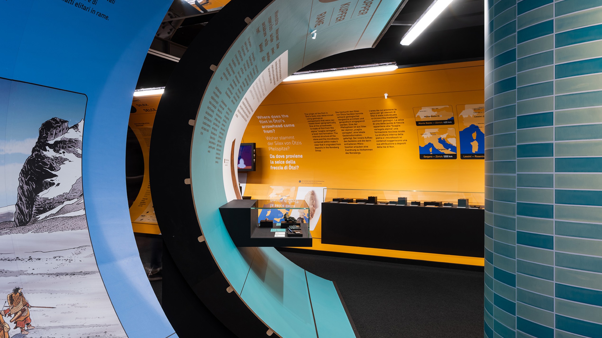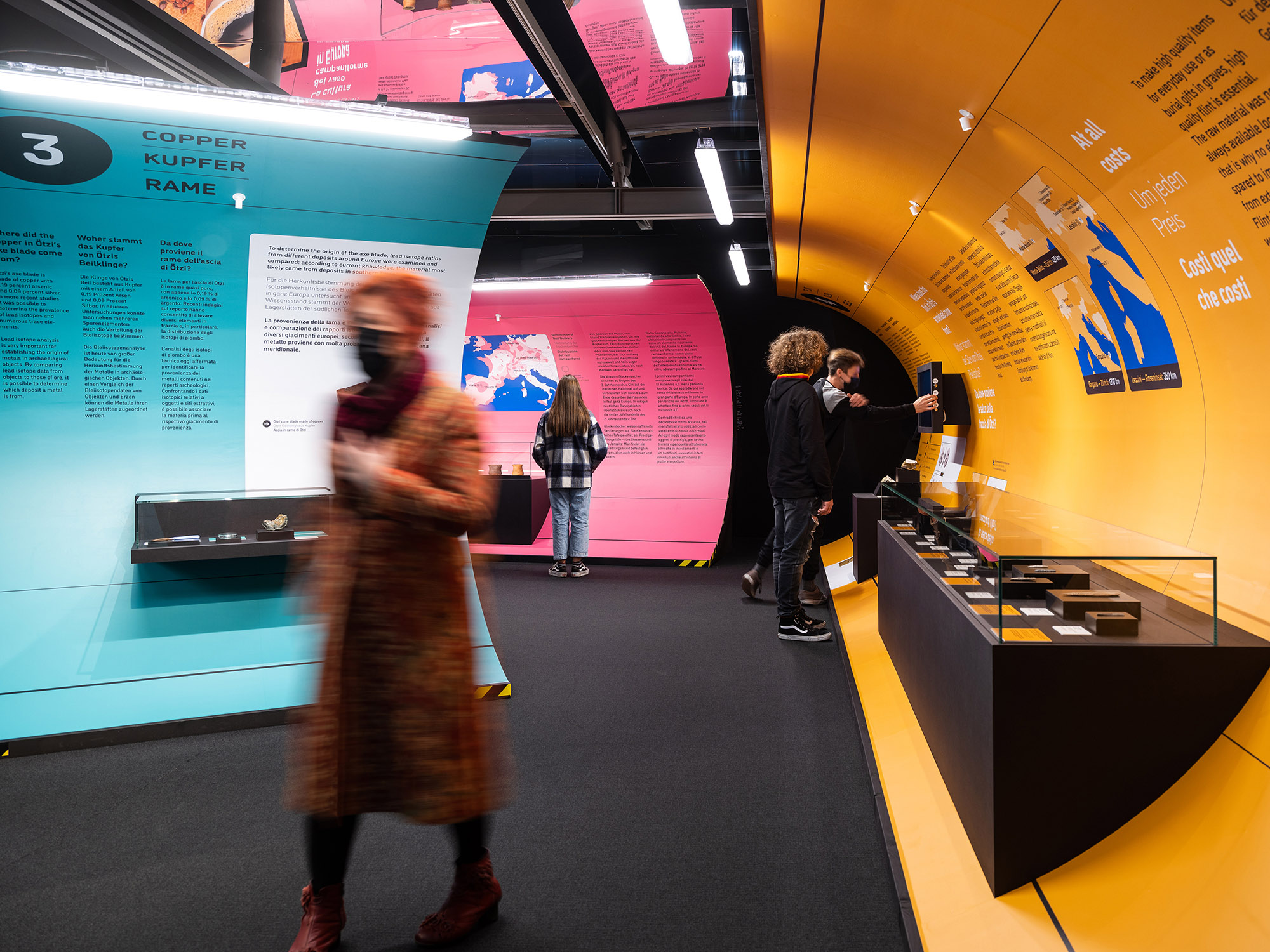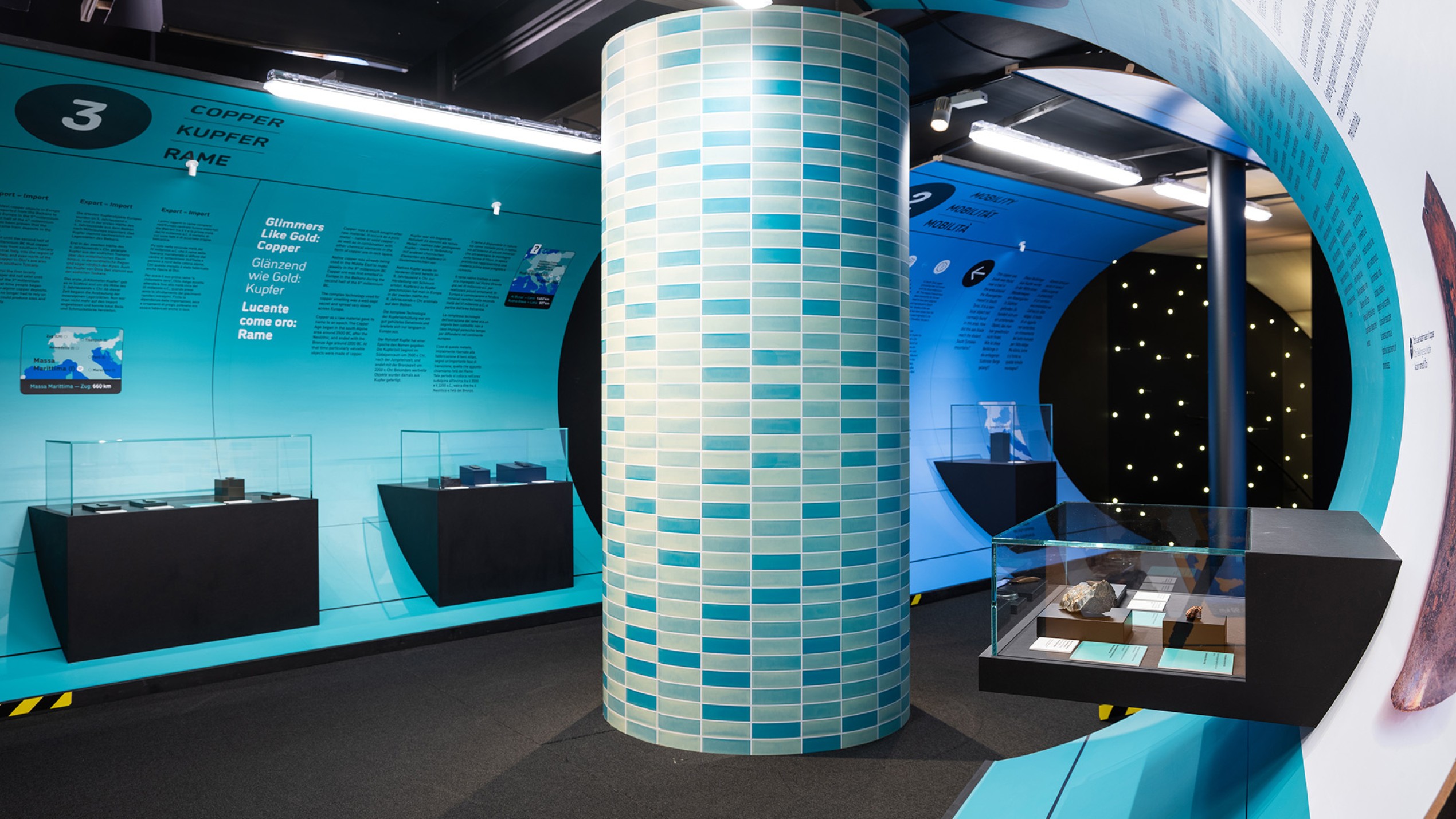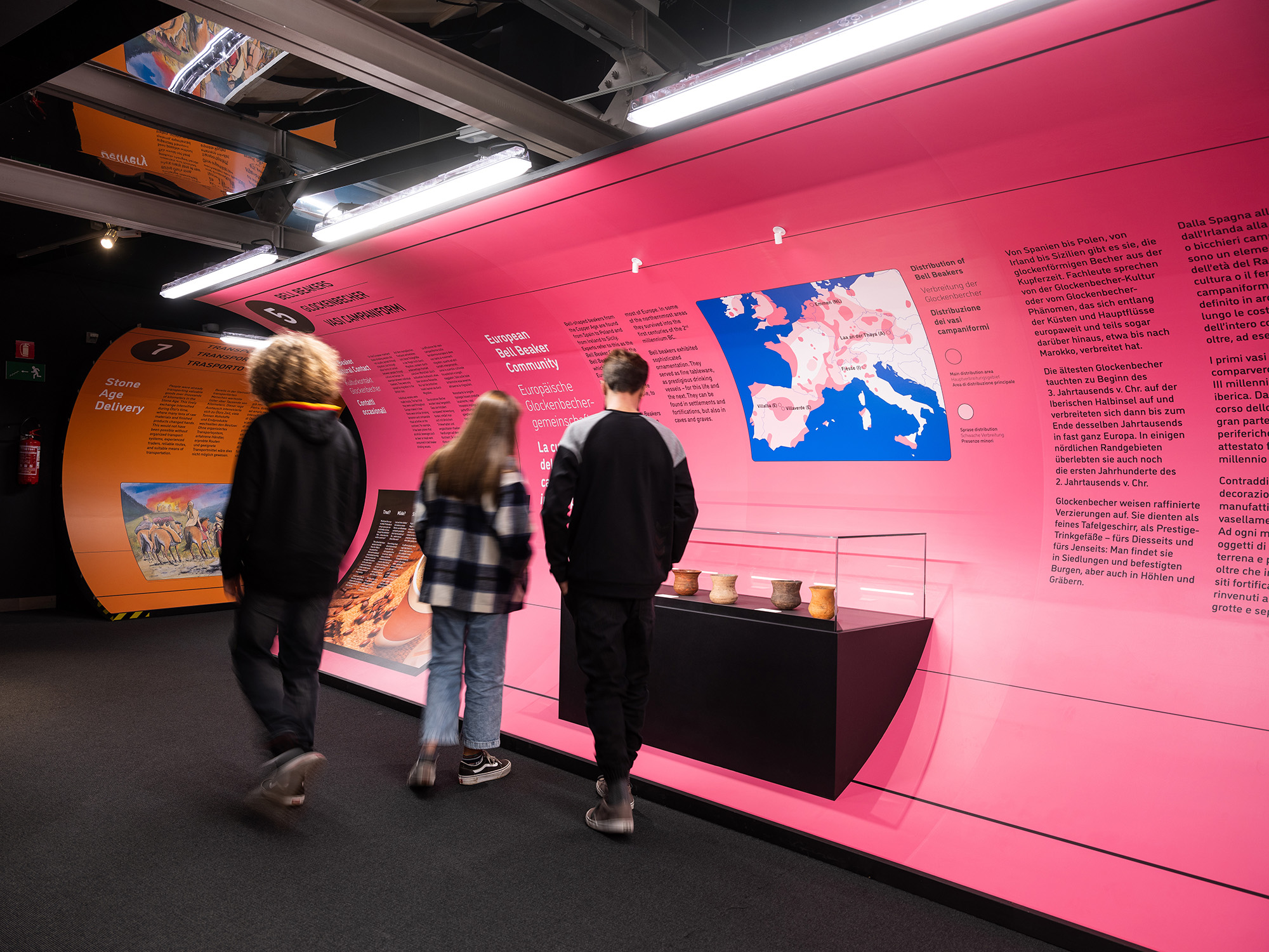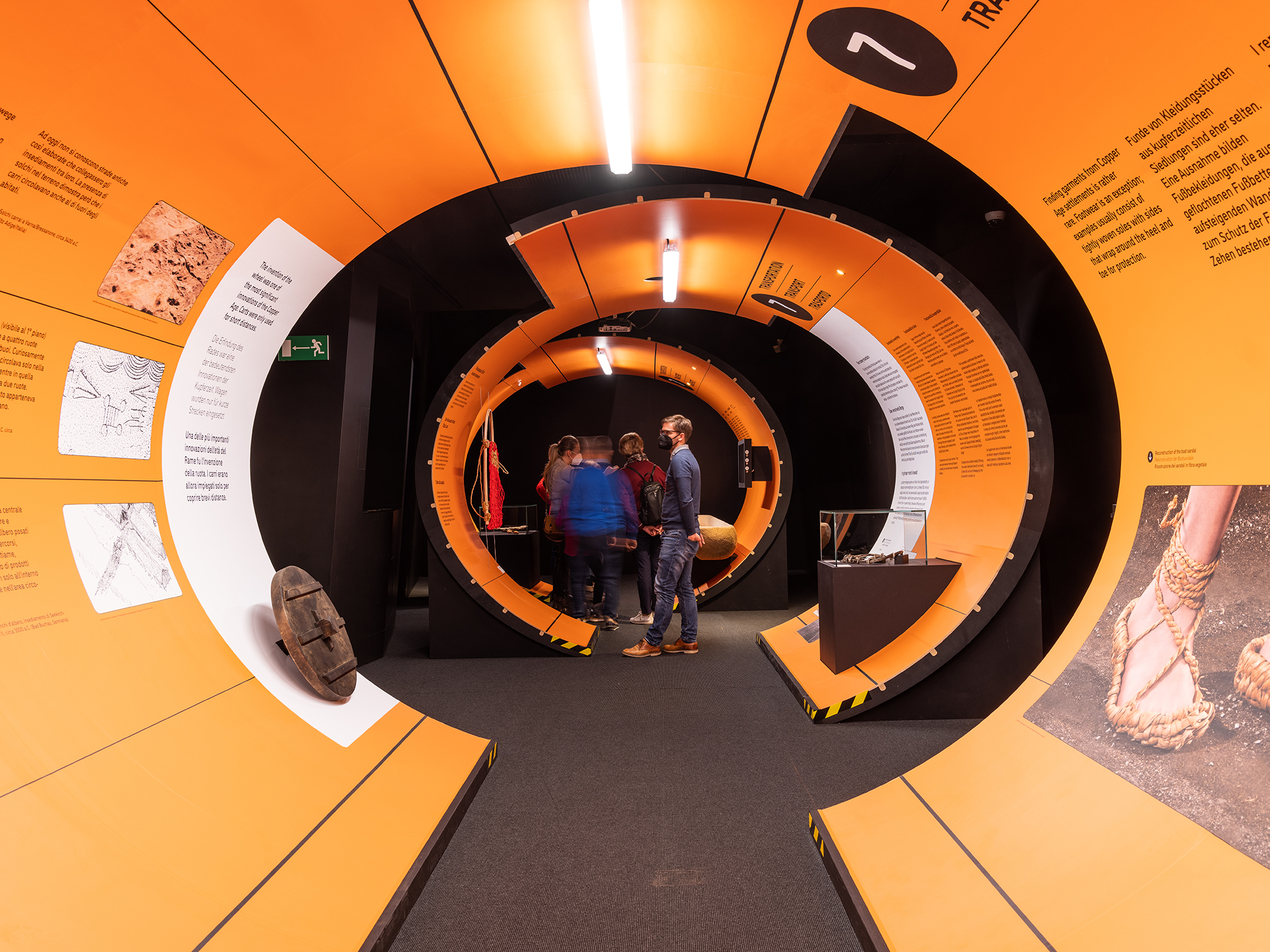 „Stone Age Connections“ macht deutlich, wie mobil die Menschen schon in der Kupferzeit waren – zu Fuß, auf Schneeschuhen oder im Einbaum. Sie handelten mit Feuerstein und Kupfer und transportierten neues Wissen sowie handwerkliche Fertigkeiten durch ganz Europa. Die Ausstellungsarchitektur ist einem U-Bahnhof nachempfunden; ein inszenatorisches Konzept, das Bewegung, Orientierung und Raumfluss in den Mittelpunkt stellt. Grafische Leitsysteme, raumgreifende Installationen und mediale Elemente erzeugen eine Dynamik, die Besucher dazu einlädt, Mobilität physisch und räumlich neu zu erleben.