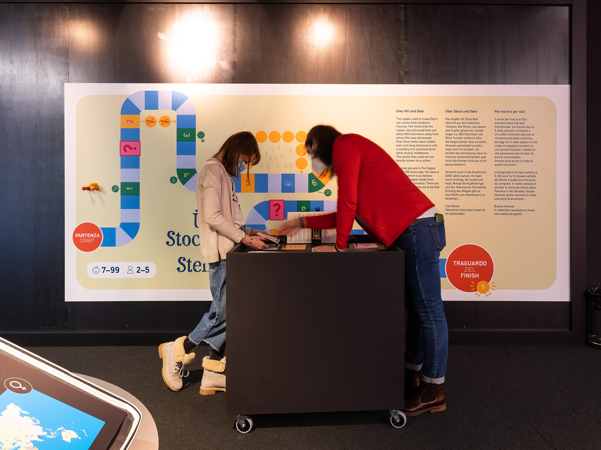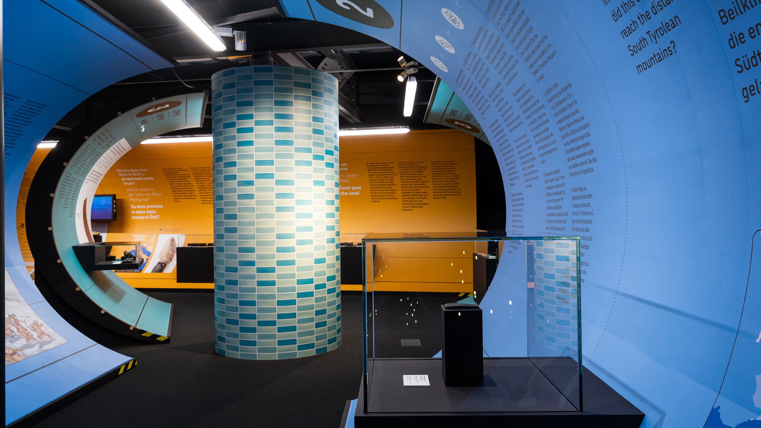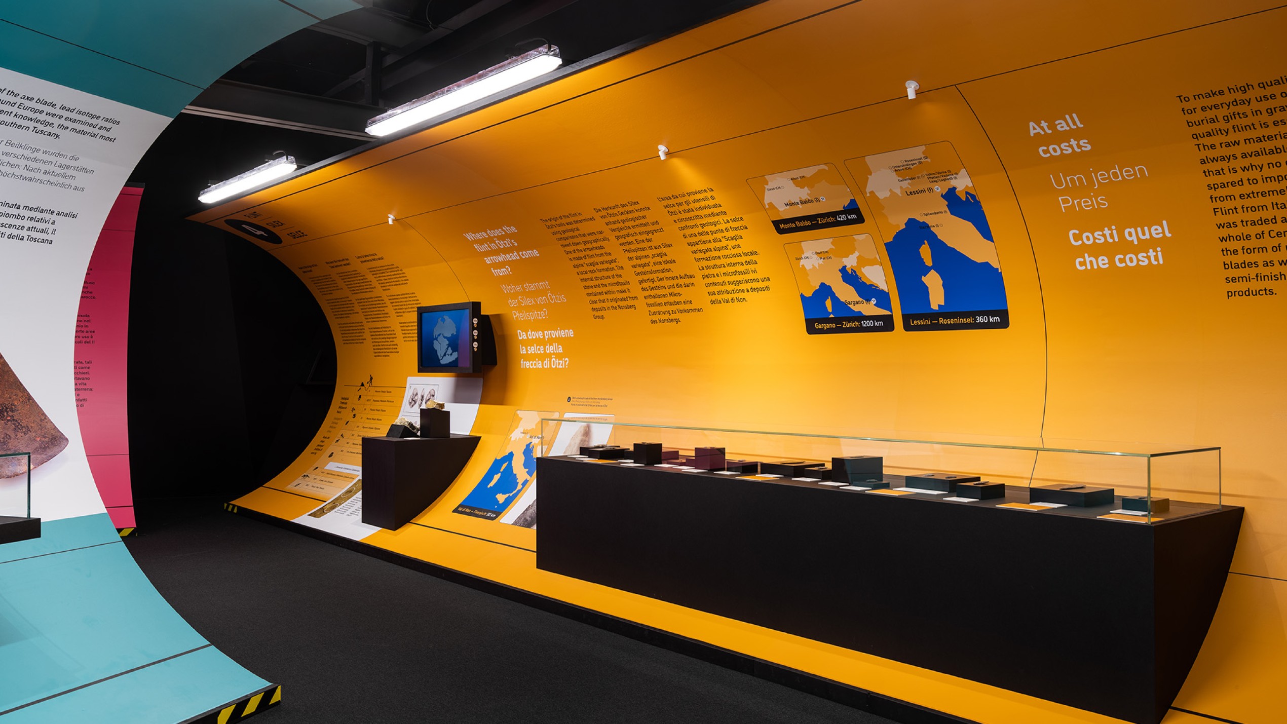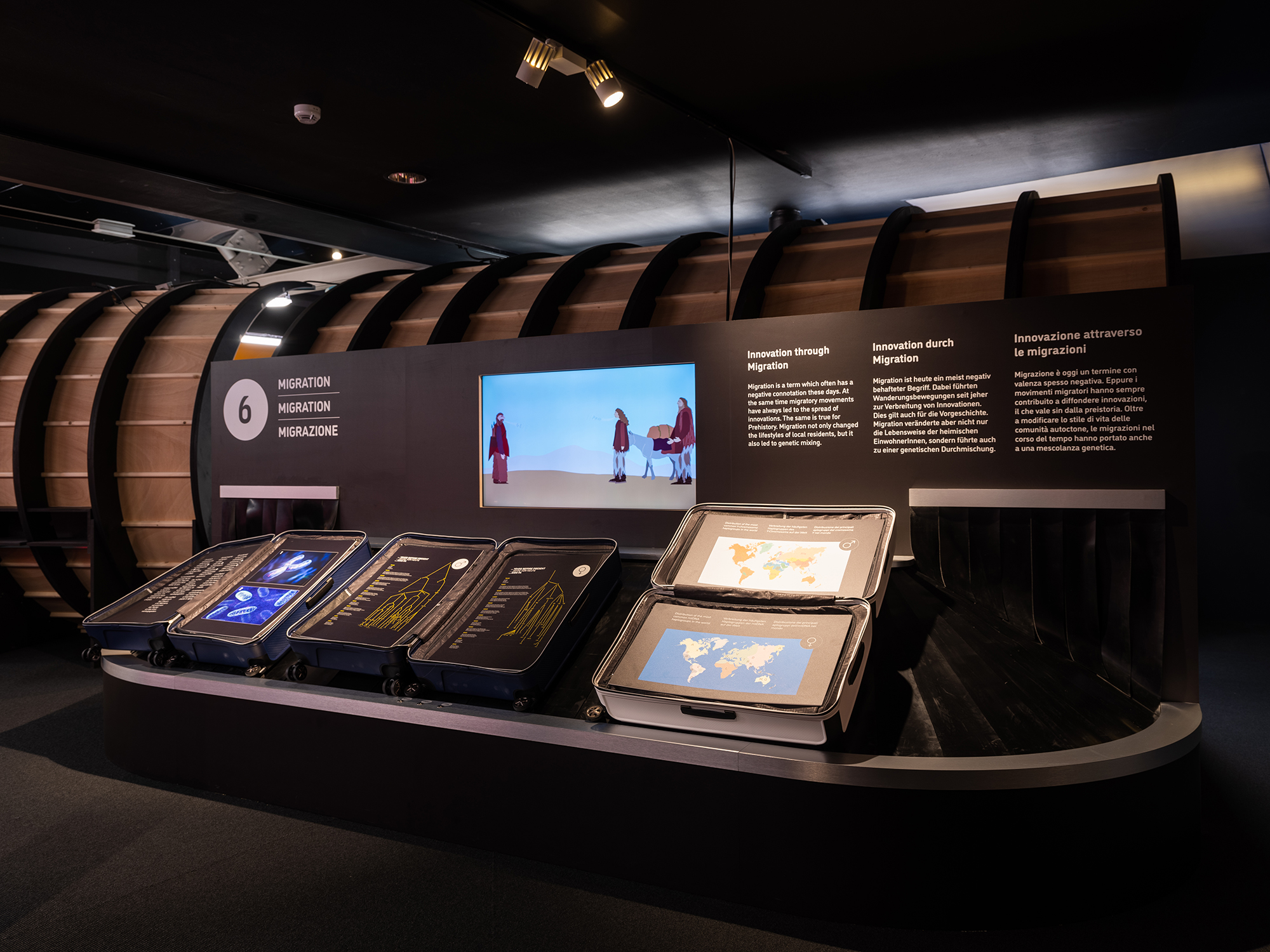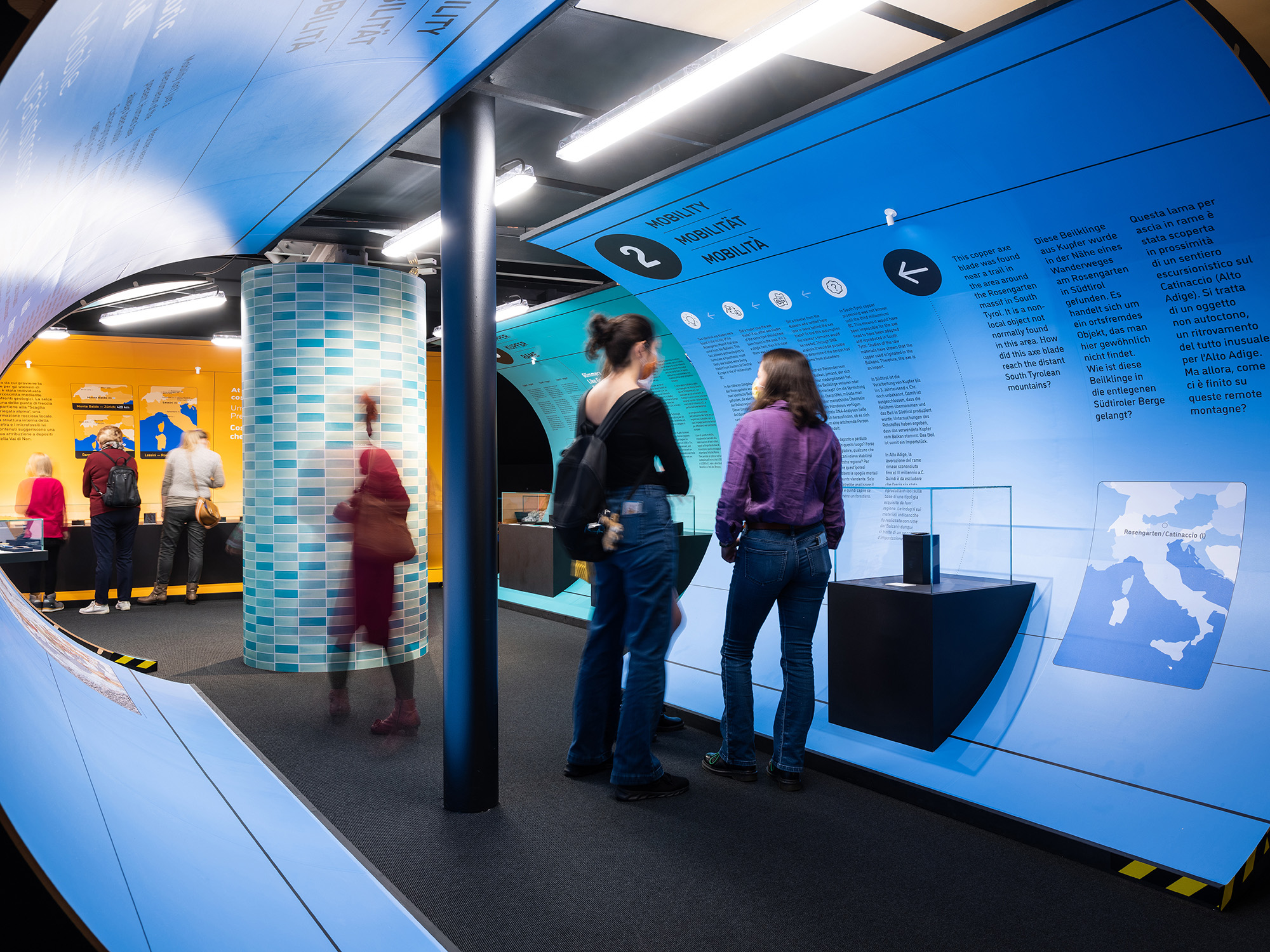 „Stone Age Connections“ macht deutlich, wie mobil die Menschen schon in der Kupferzeit waren – zu Fuß, auf Schneeschuhen oder im Einbaum. Sie handelten mit Feuerstein und Kupfer und transportierten neues Wissen sowie handwerkliche Fertigkeiten durch ganz Europa. Die Ausstellungsarchitektur ist einem U-Bahnhof nachempfunden; ein inszenatorisches Konzept, das Bewegung, Orientierung und Raumfluss in den Mittelpunkt stellt. Grafische Leitsysteme, raumgreifende Installationen und mediale Elemente erzeugen eine Dynamik, die Besucher dazu einlädt, Mobilität physisch und räumlich neu zu erleben.