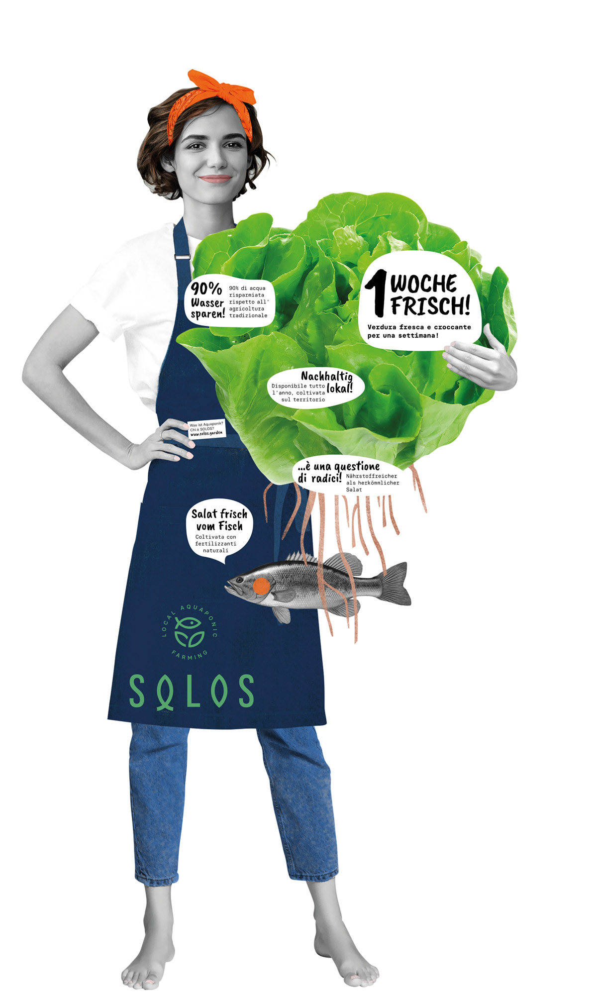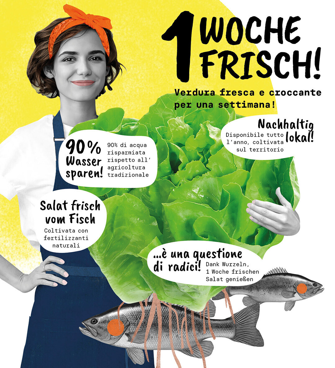 Ein junges Startup aus Tramin möchte seine Vision einer nachhaltigen Kreislaufwirtschaft kommunizieren. Die Herausforderung: ein Markenauftritt, der Salat und Fisch als Hauptprodukte sichtbar macht, gleichzeitig urban-modern wirkt, aber auch Bodenständigkeit und lokale Verbundenheit transportiert.
