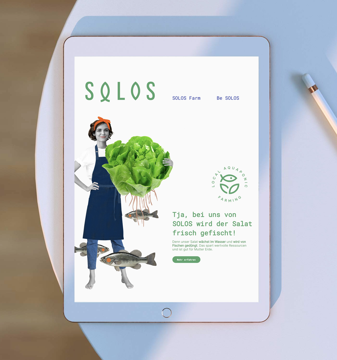 Für Solos Farm entstand ein Corporate Design, das die Essenz des Unternehmens auf den Punkt bringt: Nachhaltigkeit, Transparenz und Frische. Kernstück ist der Claim „Dein Salat… frisch gefischt“, der den USP in einem prägnanten Satz verankert. Das visuelle Konzept kombiniert ein reduziertes, klares Grundlayout mit expressiven Collagen. Diese Collagen sind nicht nur Eyecatcher, sondern erklären in einer gestalterisch eigenständigen Bildsprache den komplexen Aquaponik-Kreislauf – und sind modular für Website, Social Media, Verpackungen und POS-Material einsetzbar. Farb- und Formensprache schaffen die Balance zwischen zeitgemäßem Hipster-Charme und authentischer Regionalität. So wird die Marke visuell greifbar, wiedererkennbar und erweiterbar.