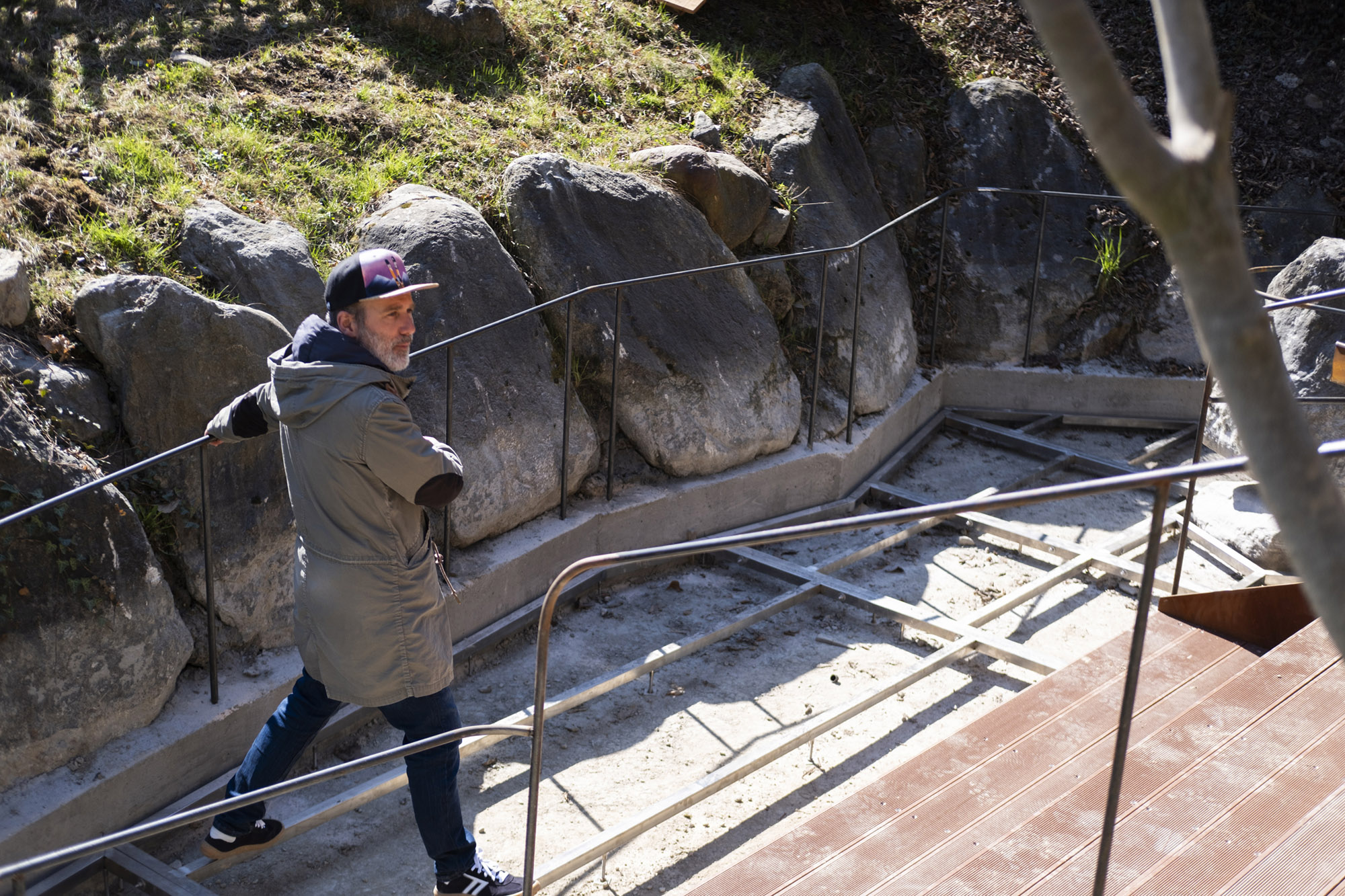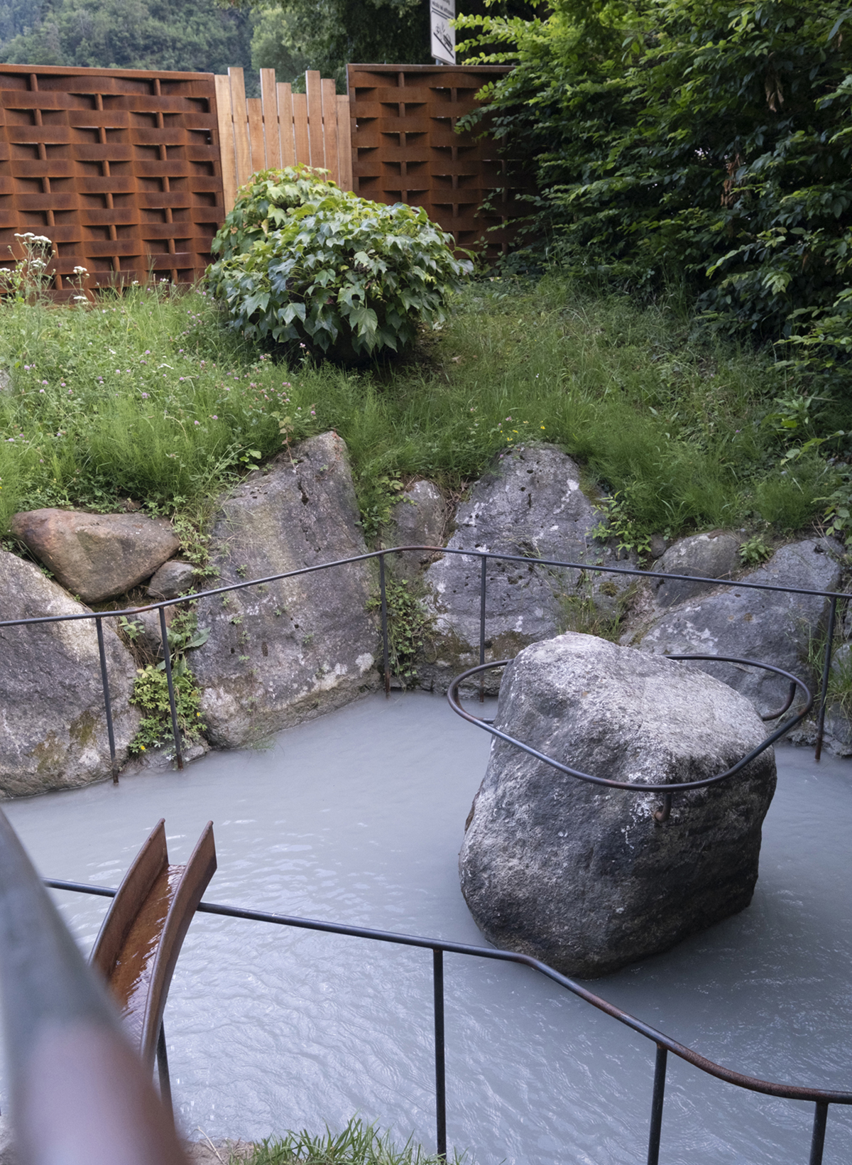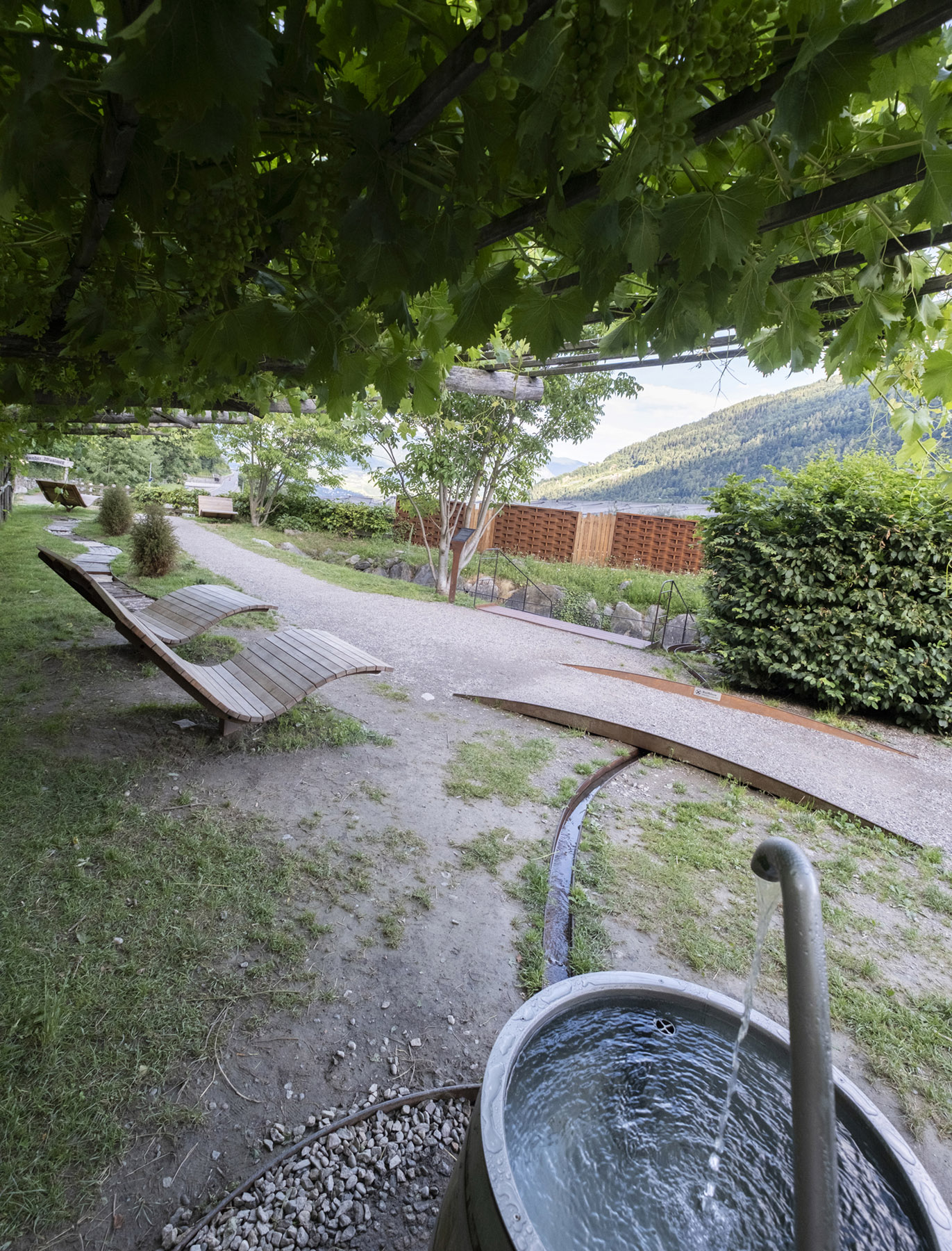Am Beginn des Algunder Waalwegs sprudelt neues Leben: Die Kneippanlage Algund vereint die fünf Säulen der Kneipp-Philosophie mit bäuerlicher Alltagsästhetik – bewusst so gestaltet, dass sie sich optisch in die Landschaft einfügt. Wasser aus dem Waal fließt über ein zum Trinkbrunnen umgebautes Weinfass und von dort ins Naturstein-Kneippbecken. Dezente Handläufe und ein Sichtschutz aus handgeflochtenen Metallbändern – inspiriert von historischen Weinkörben – sorgen dafür, dass die Anlage mit den angrenzenden Weinbergen verschmilzt. Lounge-Liegen und ein Automat mit regionalen Produkten machen die Kneippanlage zum idealen Ort für eine gesunde Pause.