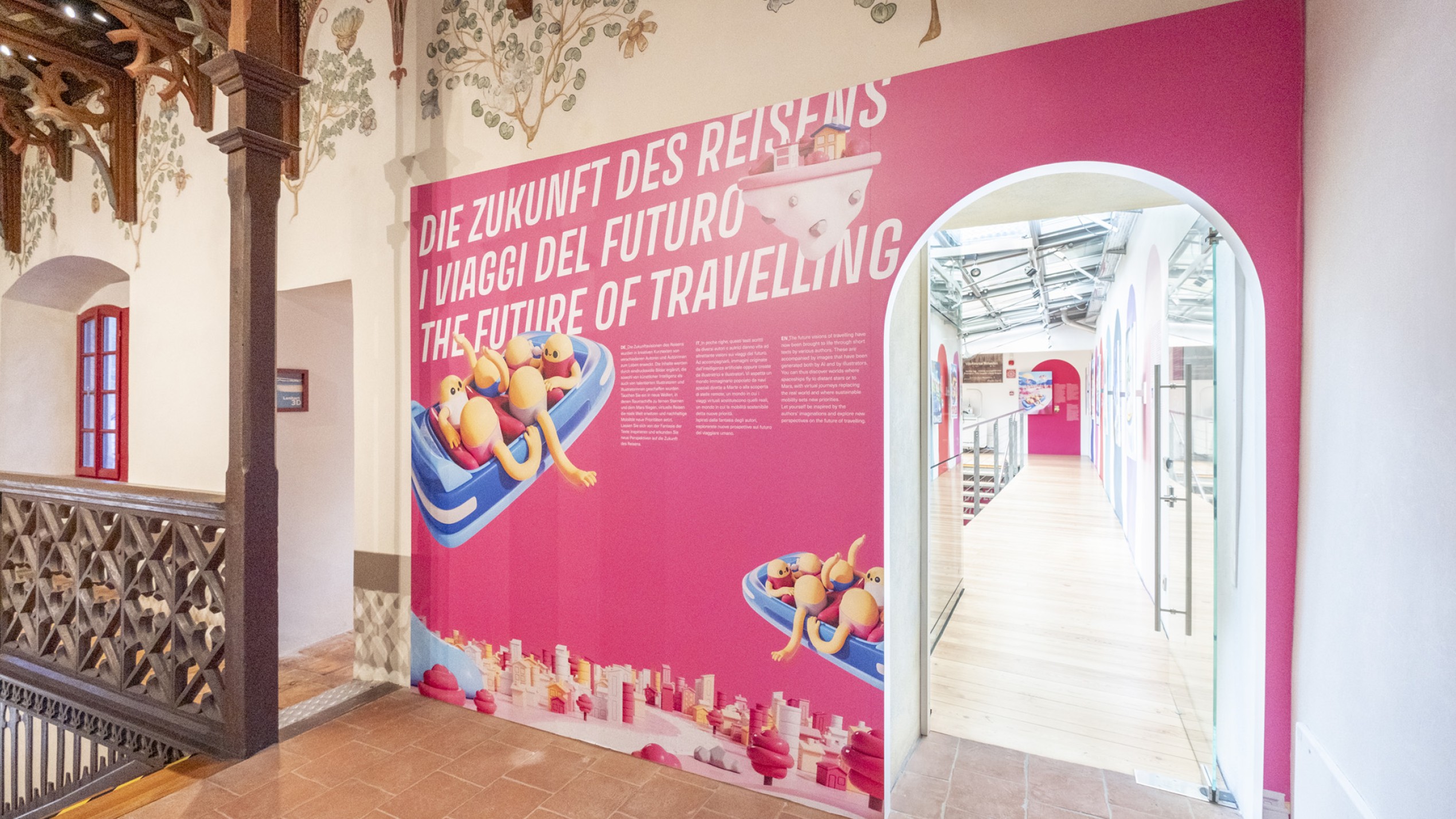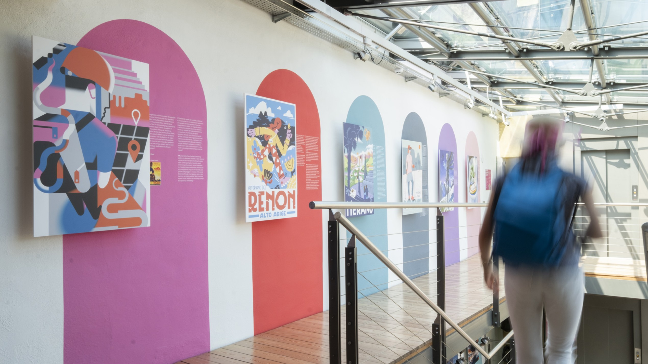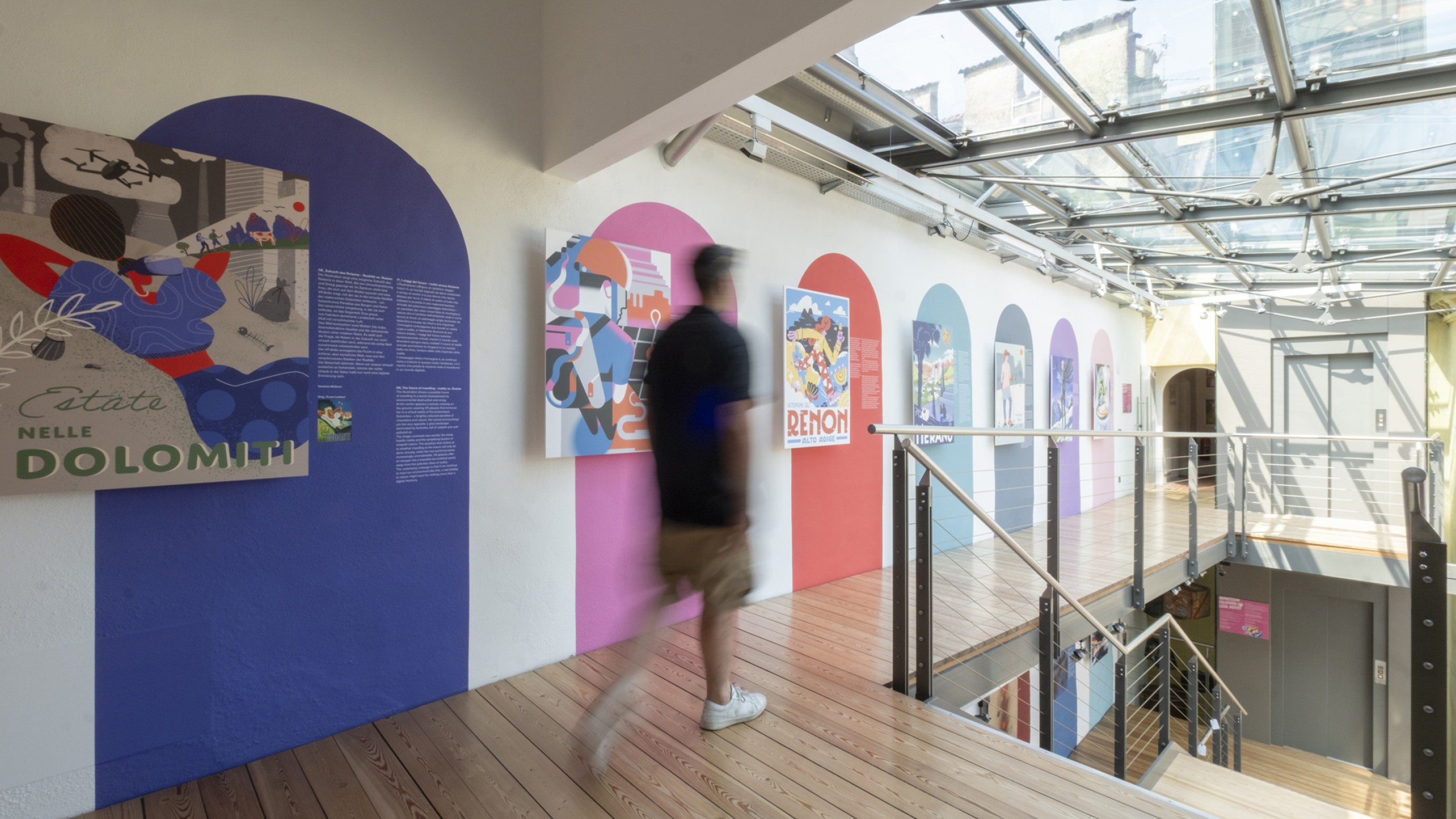 Im Treppenhaus des Südtiroler Landesmuseums für Tourismus – Touriseum im Schloss Trauttmansdorff in Meran wird „Die Zukunft des Reisens“ zur visuellen Fragestellung: Wie reisen wir heute? Wie werden wir morgen reisen? Und was bedeutet das für uns? Anstelle von Zahlen und Statistiken setzt die Ausstellung auf Assoziationen, Interpretationen und Überraschungen. Im oberen Treppenstock lassen zeitgenössische Illustratoren Franz Lenharts ikonische Tourismusplakate aus der ersten Hälfte des 20. Jahrhunderts so neu entstehen, als kämen sie aus einer noch unentdeckten Zukunft – farbig, lebendig, spielerisch. Im unteren Teil verwandelt Künstliche Intelligenz die Gedanken und Texte verschiedener Autorinnen und Autoren in surreale, poetische Bildwelten. Das Ergebnis ist ein Parcours, der keine Antworten vorgibt, sondern den Blick für neue Möglichkeiten öffnet.