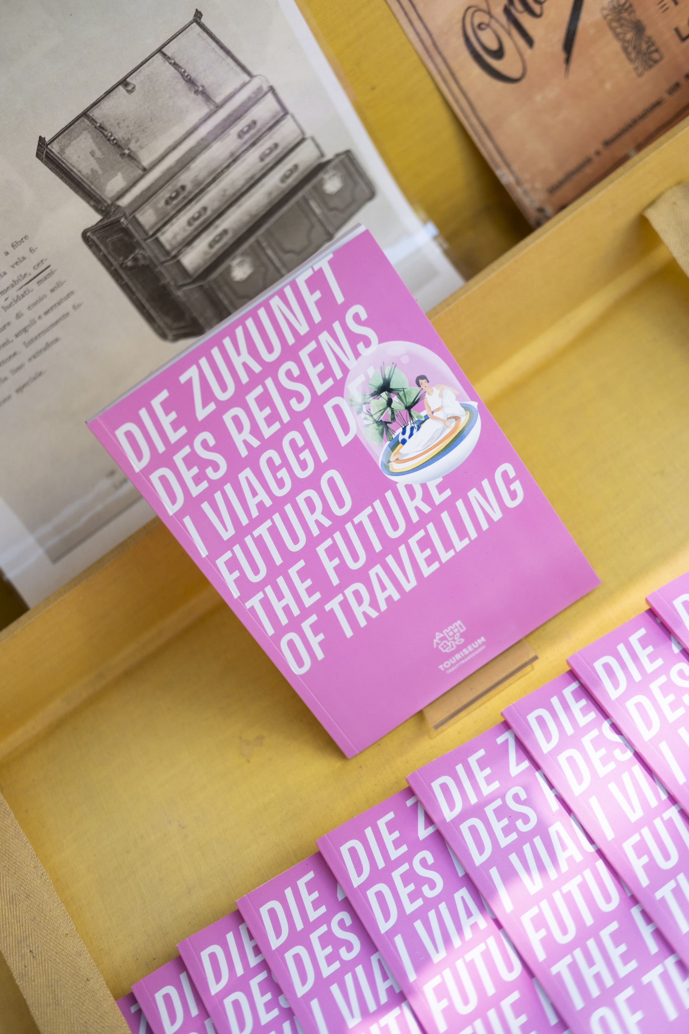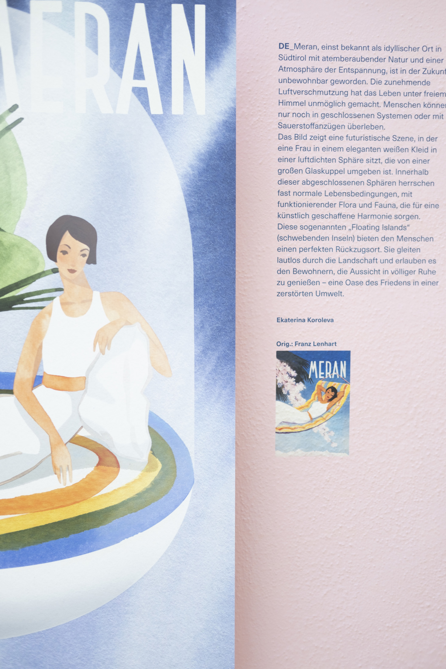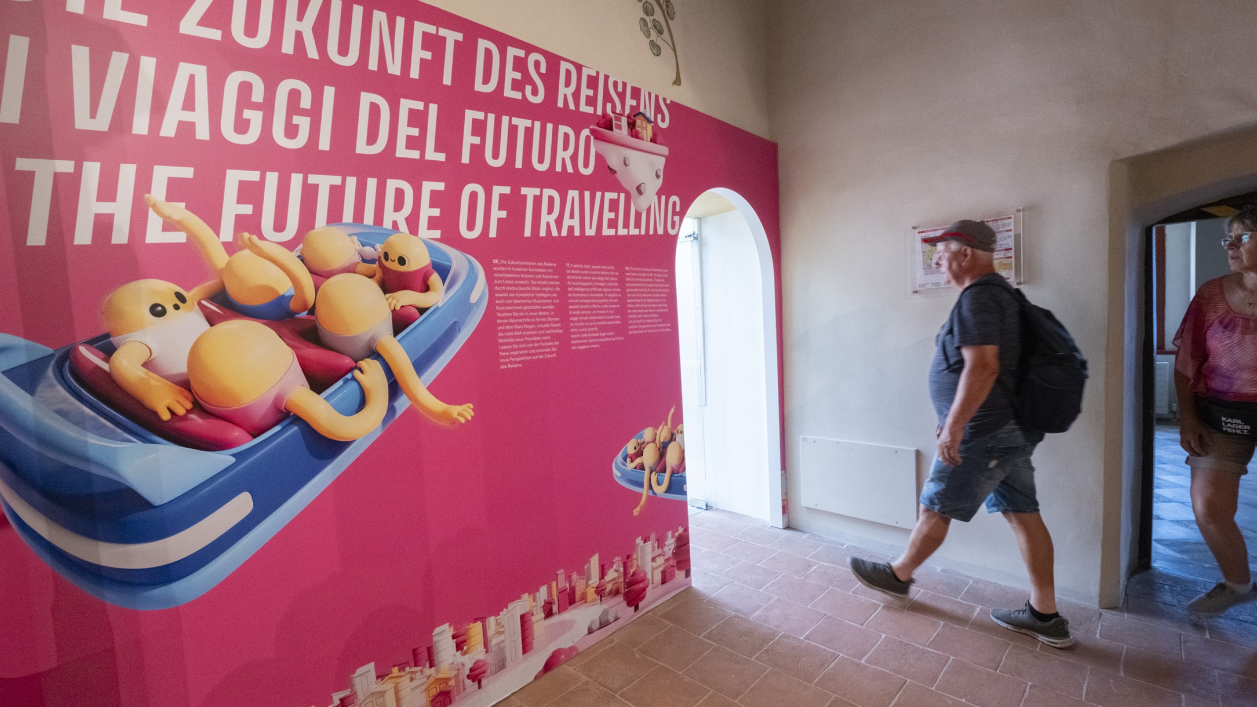 Im Treppenhaus des Südtiroler Landesmuseums für Tourismus – Touriseum im Schloss Trauttmansdorff in Meran wird „Die Zukunft des Reisens“ zur visuellen Fragestellung: Wie reisen wir heute? Wie werden wir morgen reisen? Und was bedeutet das für uns? Anstelle von Zahlen und Statistiken setzt die Ausstellung auf Assoziationen, Interpretationen und Überraschungen. Im oberen Treppenstock lassen zeitgenössische Illustratoren Franz Lenharts ikonische Tourismusplakate aus der ersten Hälfte des 20. Jahrhunderts so neu entstehen, als kämen sie aus einer noch unentdeckten Zukunft – farbig, lebendig, spielerisch. Im unteren Teil verwandelt Künstliche Intelligenz die Gedanken und Texte verschiedener Autorinnen und Autoren in surreale, poetische Bildwelten. Das Ergebnis ist ein Parcours, der keine Antworten vorgibt, sondern den Blick für neue Möglichkeiten öffnet.