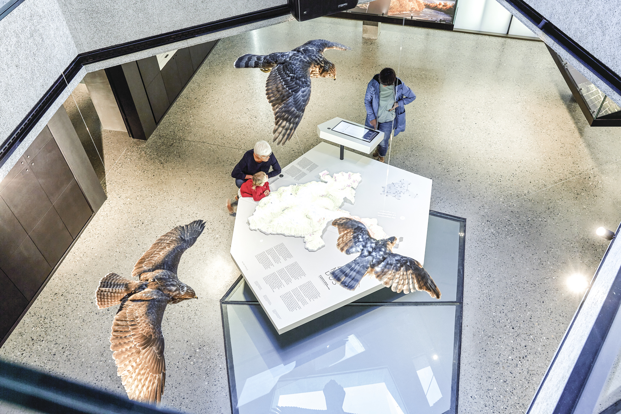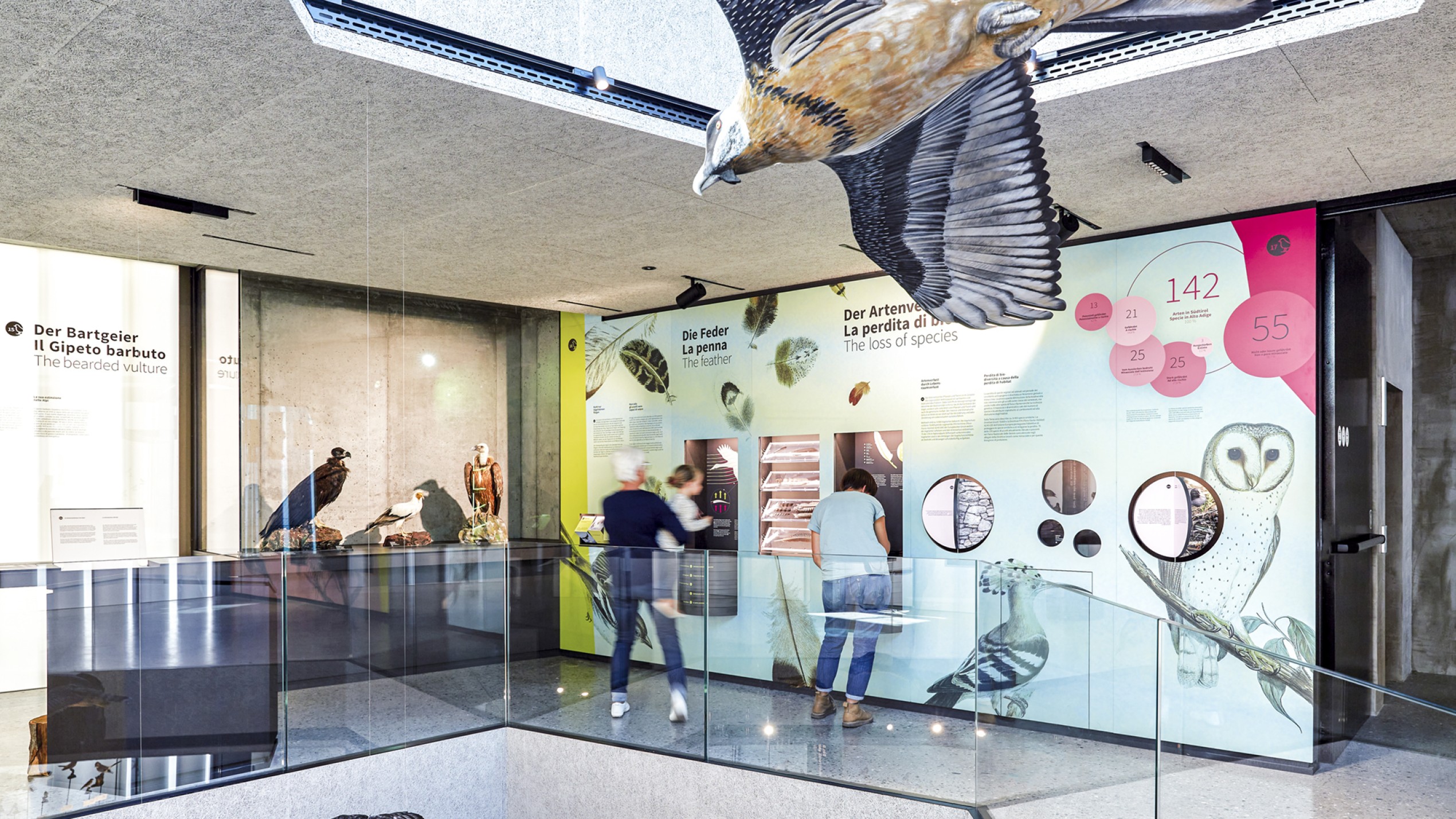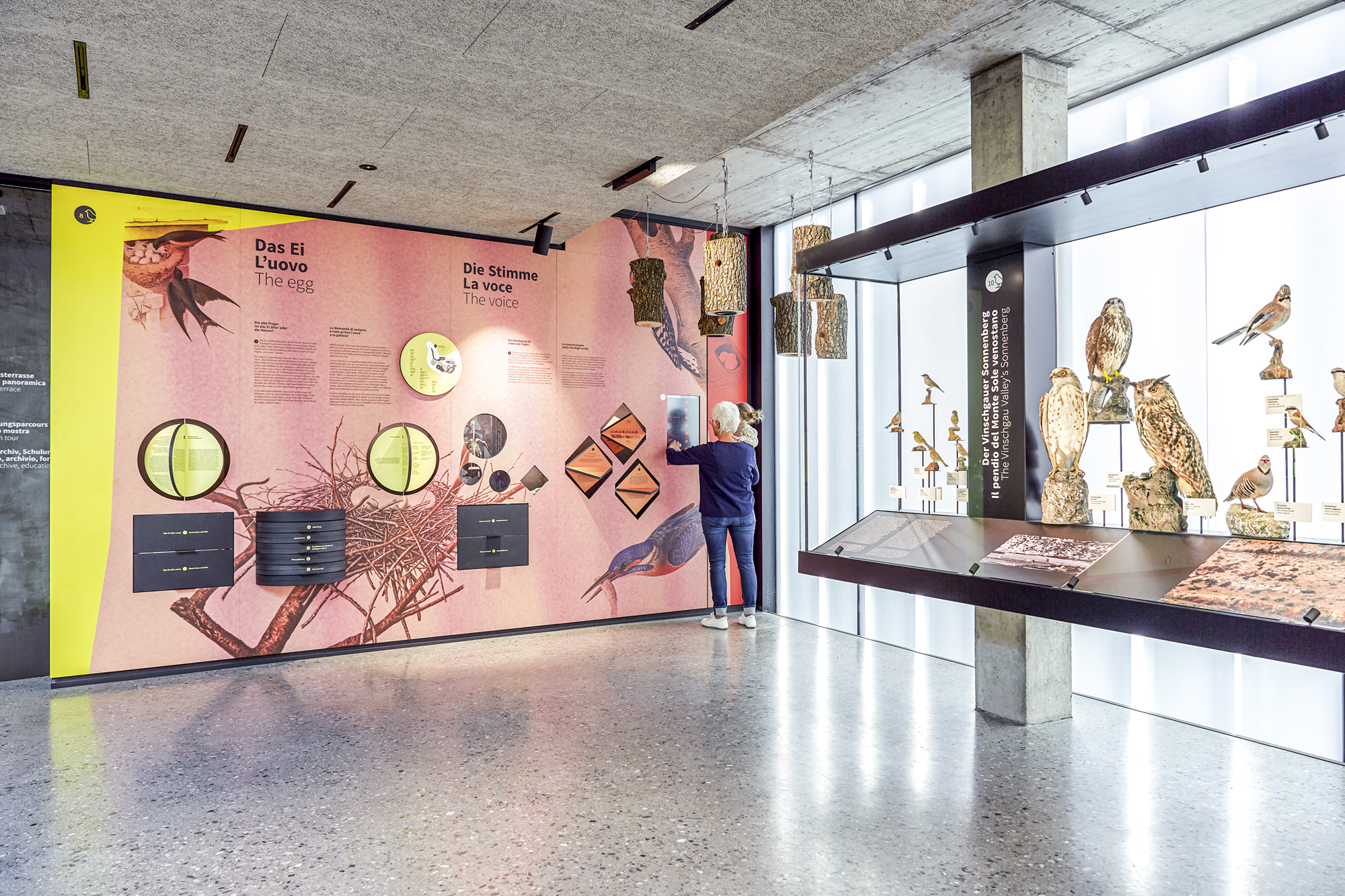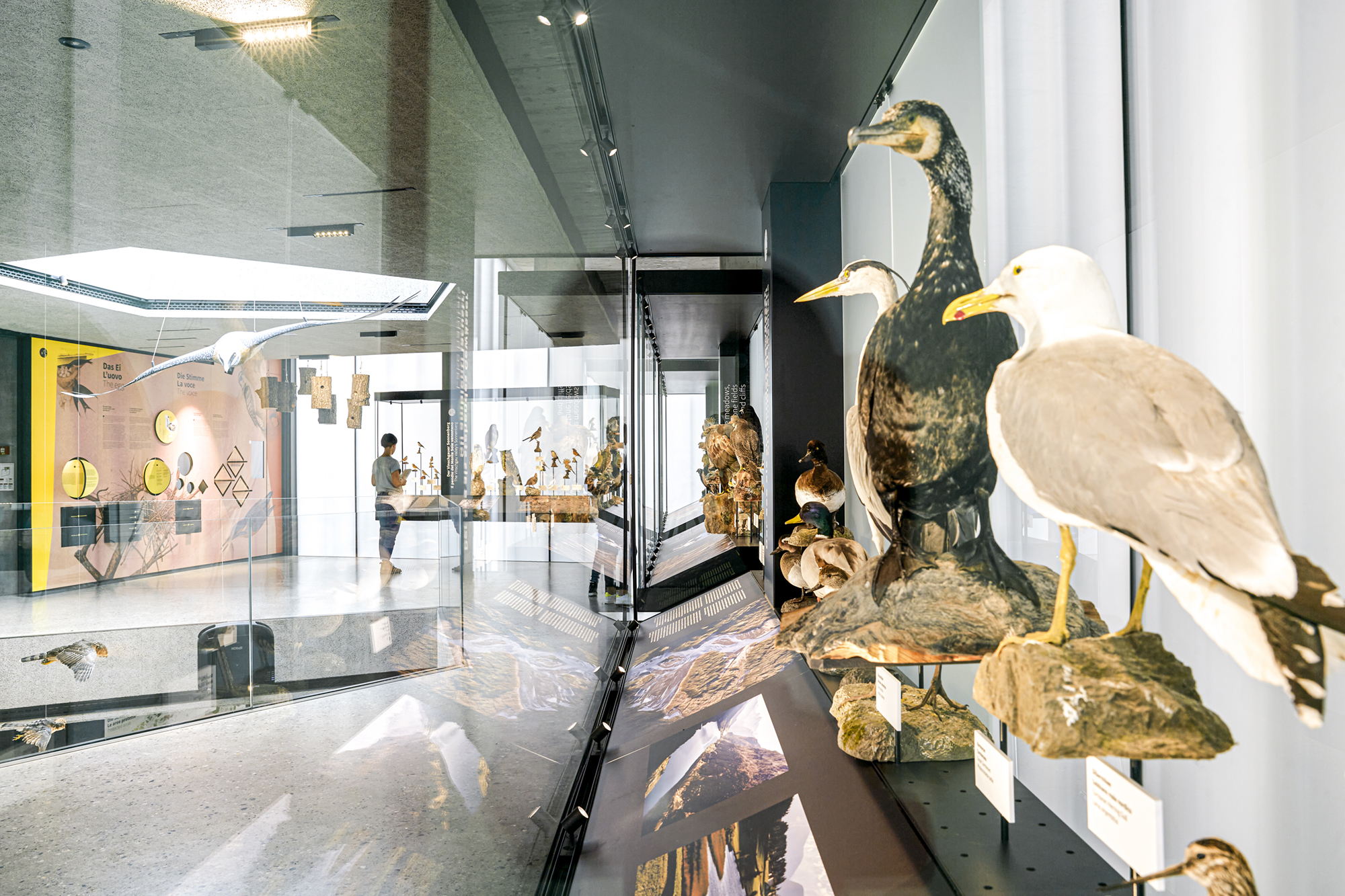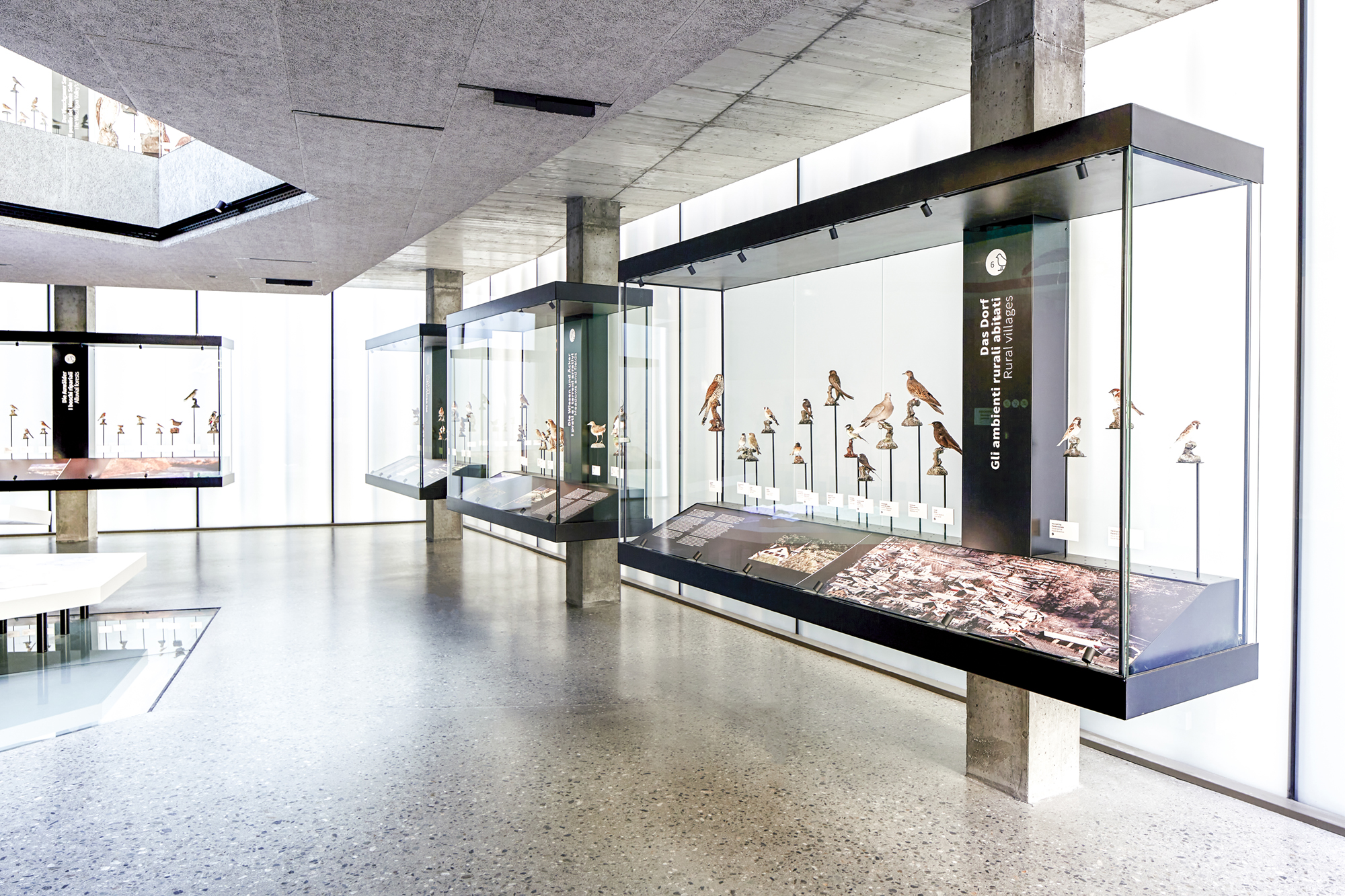 Das Museum AVIMUNDUS in Schlanders zeigt die Vogelwelt in einer klaren, transparenten Inszenierung, die den Bau der Arch. Marx & Ladurner aufnimmt und erweitert. Filigrane Vitrinen lassen Präparate scheinbar im Raum schweben, während ein interaktives 3D-Modell den Nationalpark Stilfser Joch in Miniatur erfahrbar macht. Thematisch geordnete Präsentationen führen durch die Lebensräume – vom alpinen Hochgebirge bis zu den Auen. Im Obergeschoss ermöglichen Mitmachstationen Einblicke in Flugtechnik, Fortpflanzung und Artenvielfalt. Über allem kreisen im zentralen Lichtraum Adlermodelle, die wie im Aufwind über den Köpfen der Besucher schweben.