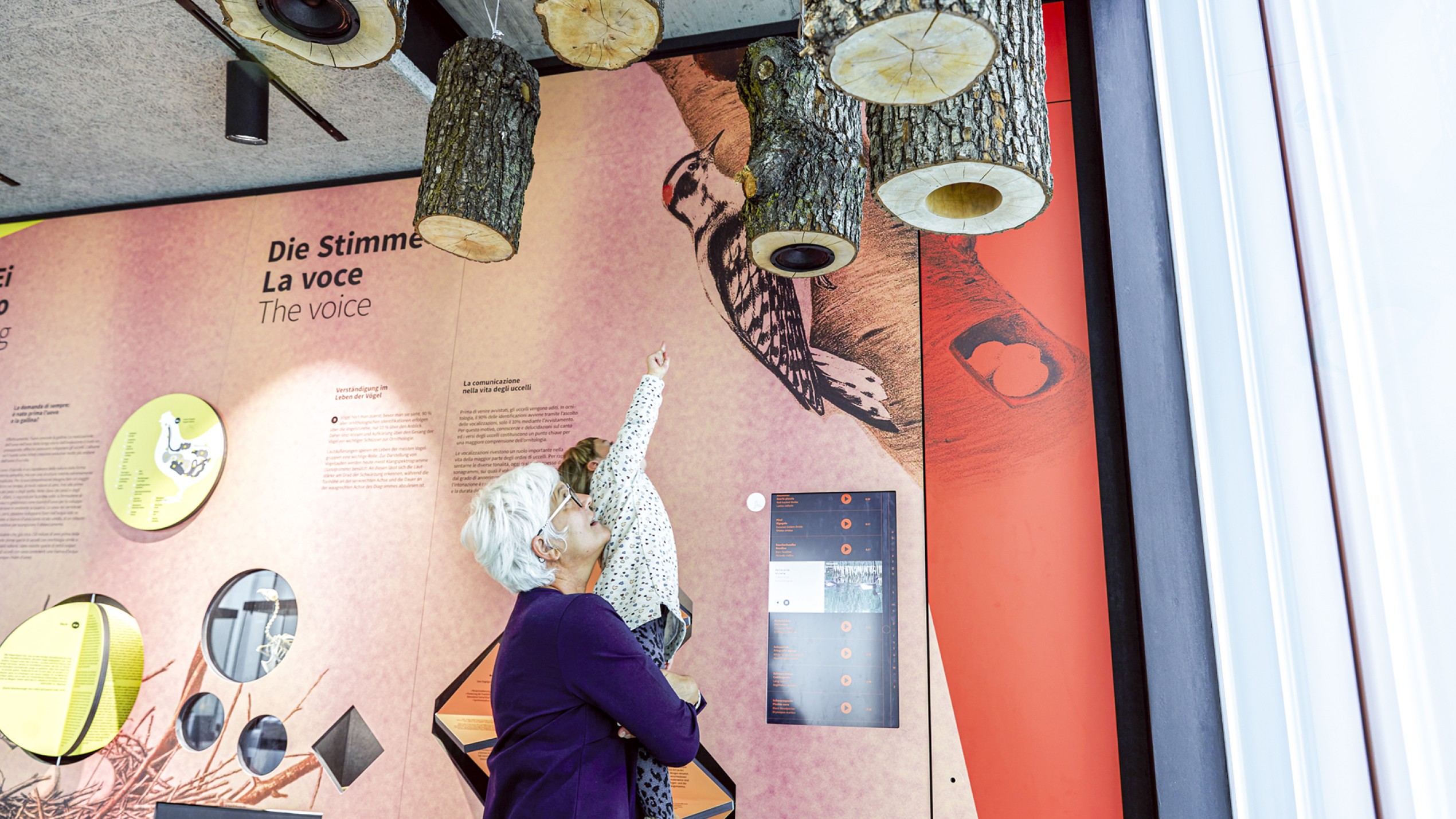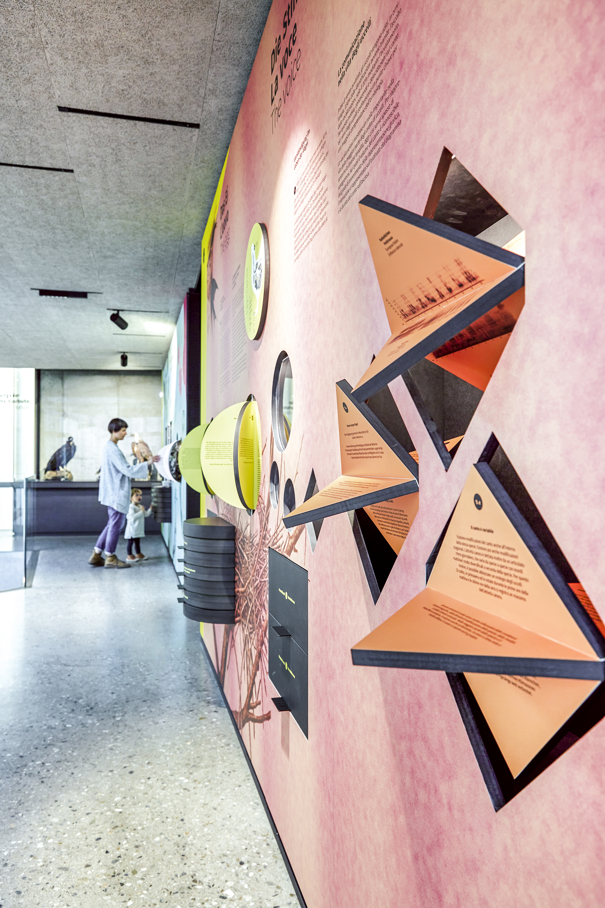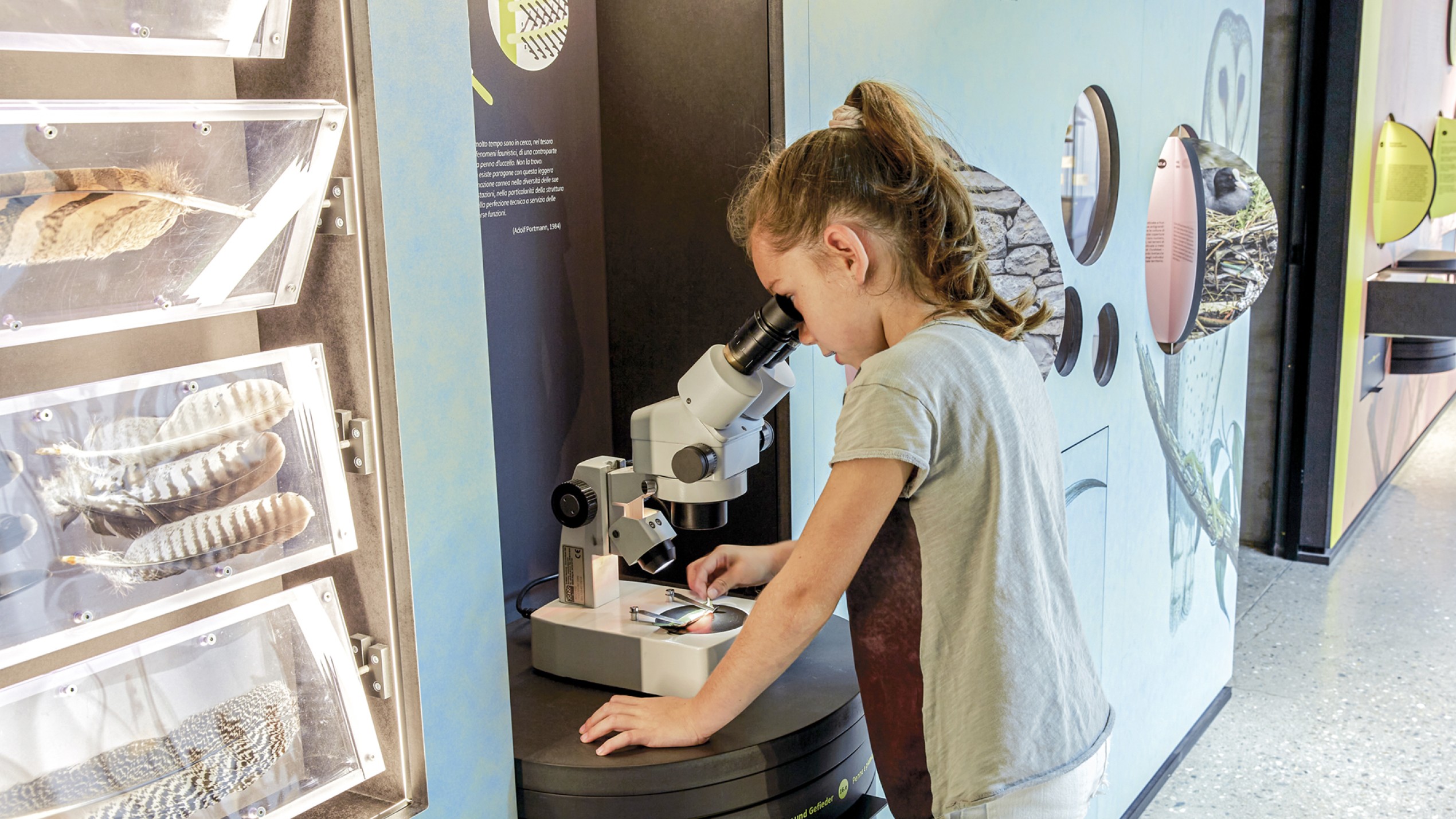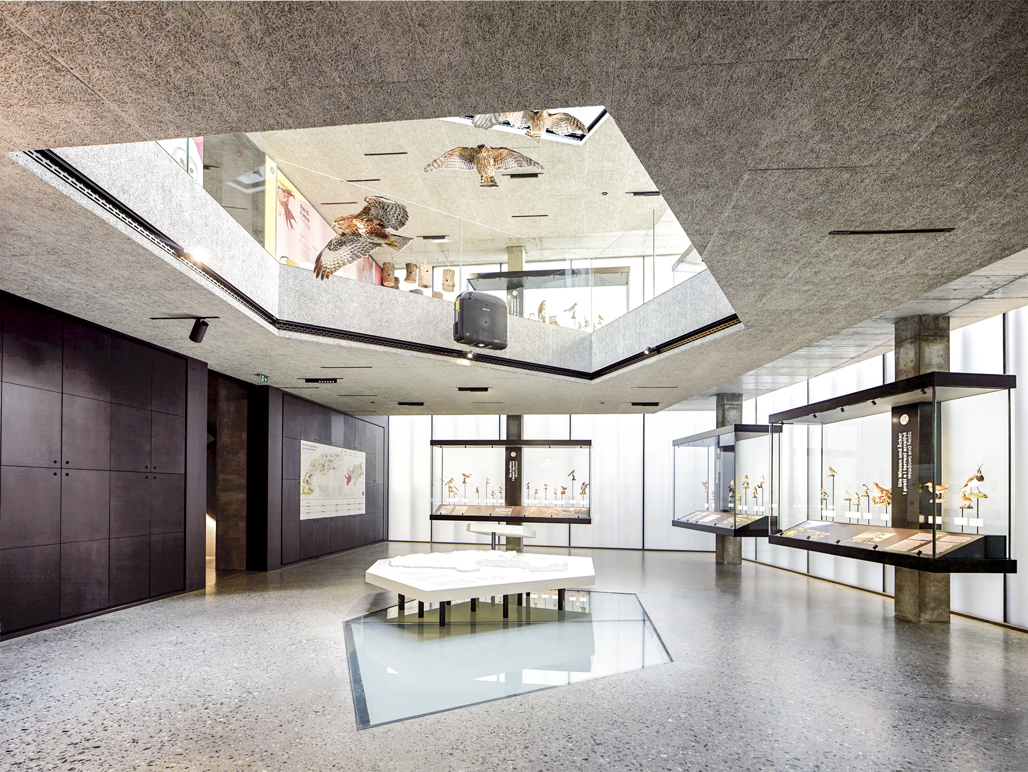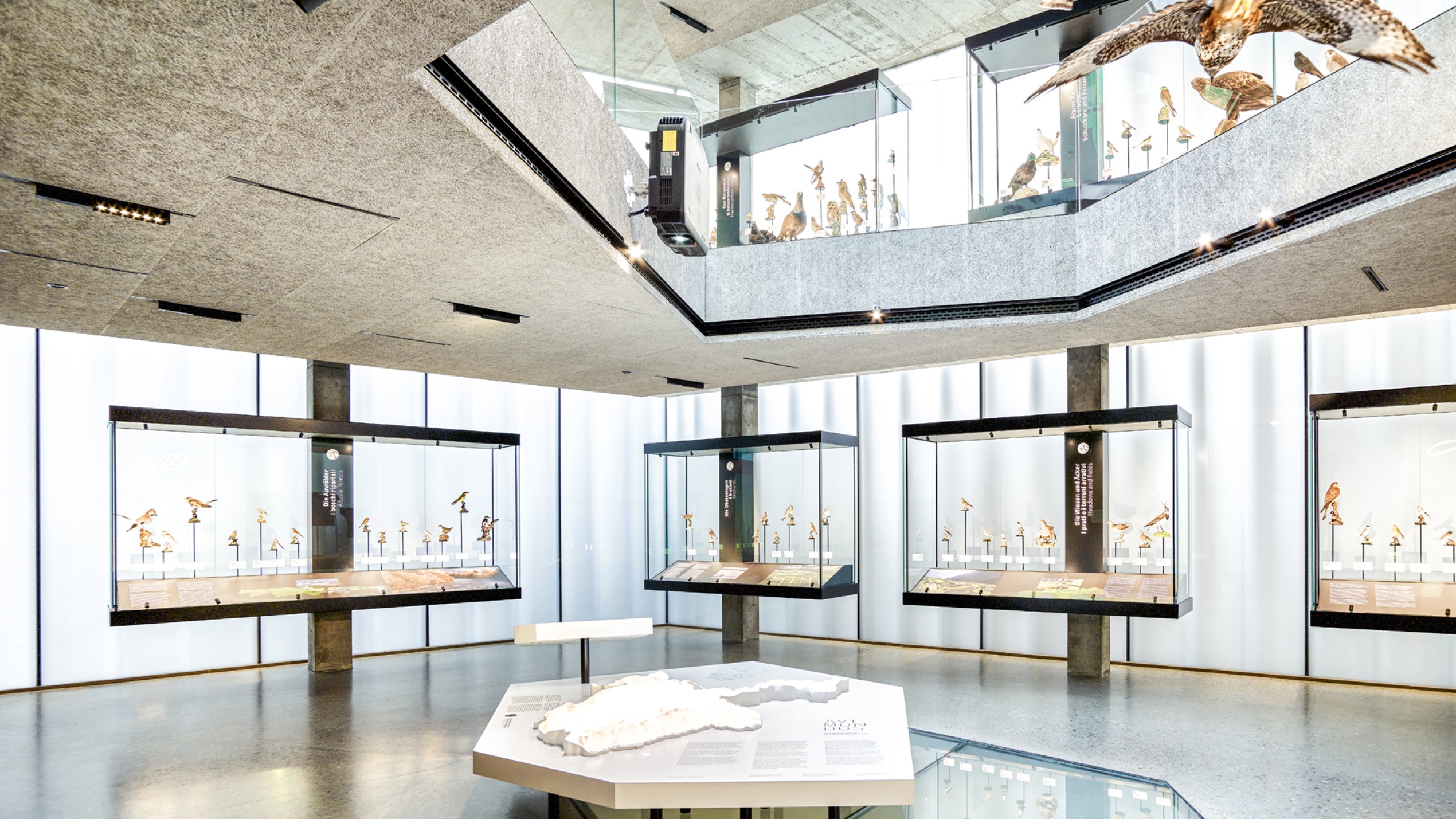 Das Museum AVIMUNDUS in Schlanders zeigt die Vogelwelt in einer klaren, transparenten Inszenierung, die den Bau der Arch. Marx & Ladurner aufnimmt und erweitert. Filigrane Vitrinen lassen Präparate scheinbar im Raum schweben, während ein interaktives 3D-Modell den Nationalpark Stilfser Joch in Miniatur erfahrbar macht. Thematisch geordnete Präsentationen führen durch die Lebensräume – vom alpinen Hochgebirge bis zu den Auen. Im Obergeschoss ermöglichen Mitmachstationen Einblicke in Flugtechnik, Fortpflanzung und Artenvielfalt. Über allem kreisen im zentralen Lichtraum Adlermodelle, die wie im Aufwind über den Köpfen der Besucher schweben.